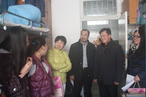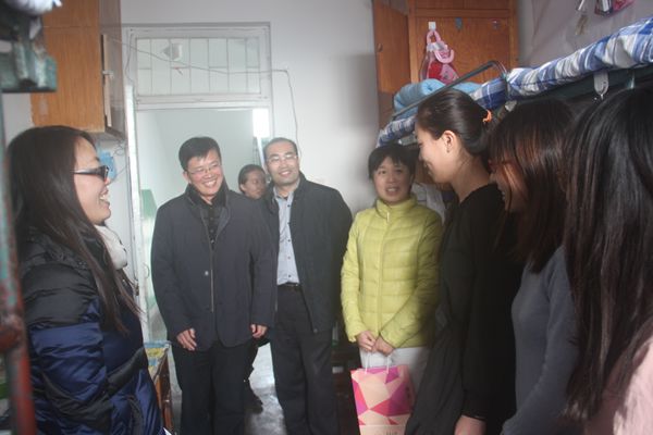 党委书记徐龙飞、院长孔伟金、副书记牟晓燕及辅导员走访了每一个物理学(师范教育)专业的学生宿舍,和同学们进行了亲切交谈。