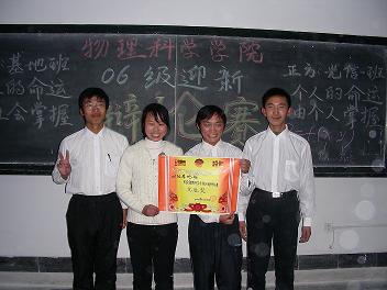 12月7日下午,十大色碟游戏网站 06迎新辩论赛决赛在西四301教室举行。进入决赛的06光信息1班和06基地班的代表队就“个人命运由自己掌握(正方)还是由社会掌握(反方)”为题展开了激烈的辩论。双方辩手引经据典、广引博证、高谈阔论,互有攻防,不时引起观众阵阵掌声。此次辩论比赛是十大色碟游戏网站 06迎新系列活动的一部分。图为获胜方06基地班代表队。