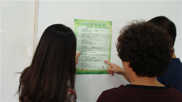 和师资的宣传单页;在宿舍内,家长和同学们挤在一起看墙上贴的“大学生活规划—35条”,这35条涵盖了“身体素质”、“学习生活环境”、“时间管理”、“高效学习”、“业余生活”、“情感塑造”、“心胸和情怀”七个方面,是色碟