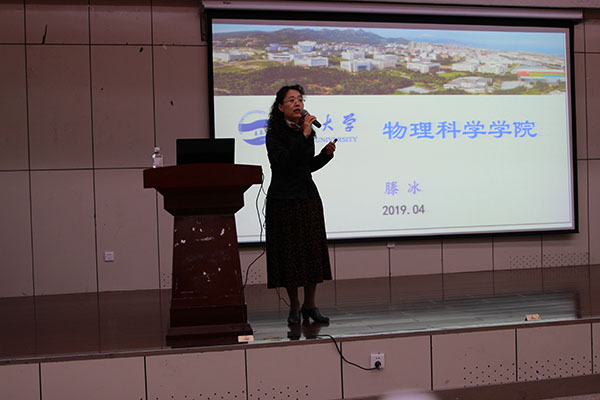 滕冰作动员讲话。她首先以自己的亲身经历为切入点,告诉同学们青春是用来奋斗的,鼓励大家要敢于尝试勇于奋斗。随后,她从历史沿革、专业设置、平台建设和重要成果、师资队伍、科研及教学成果、科研获奖、人才培养、实验条件、实验室建设、学术交流等方面介绍了色碟