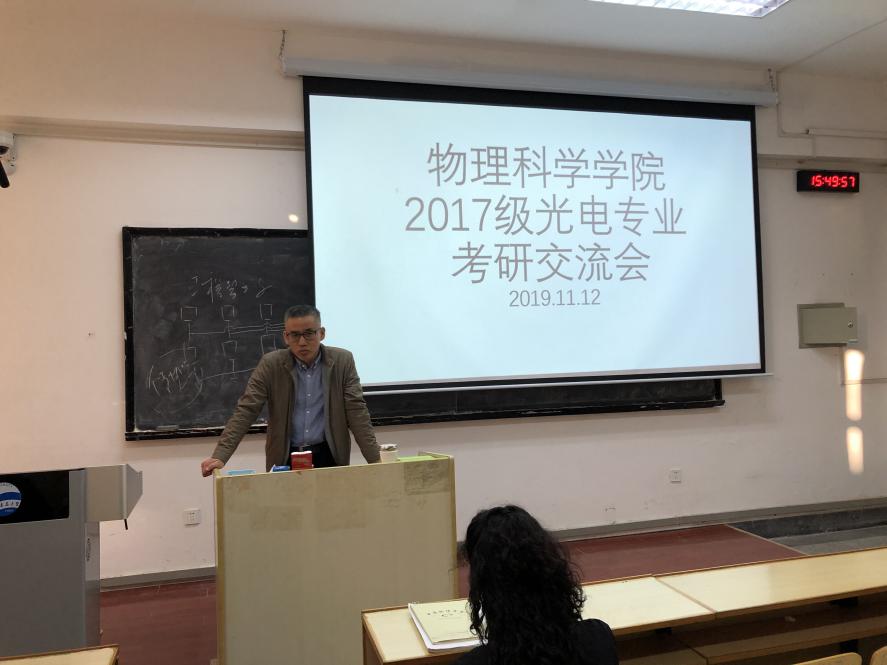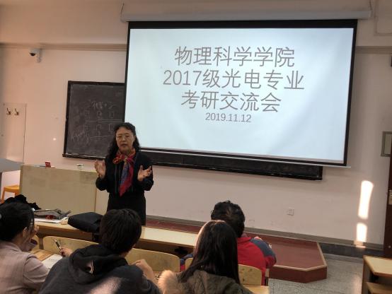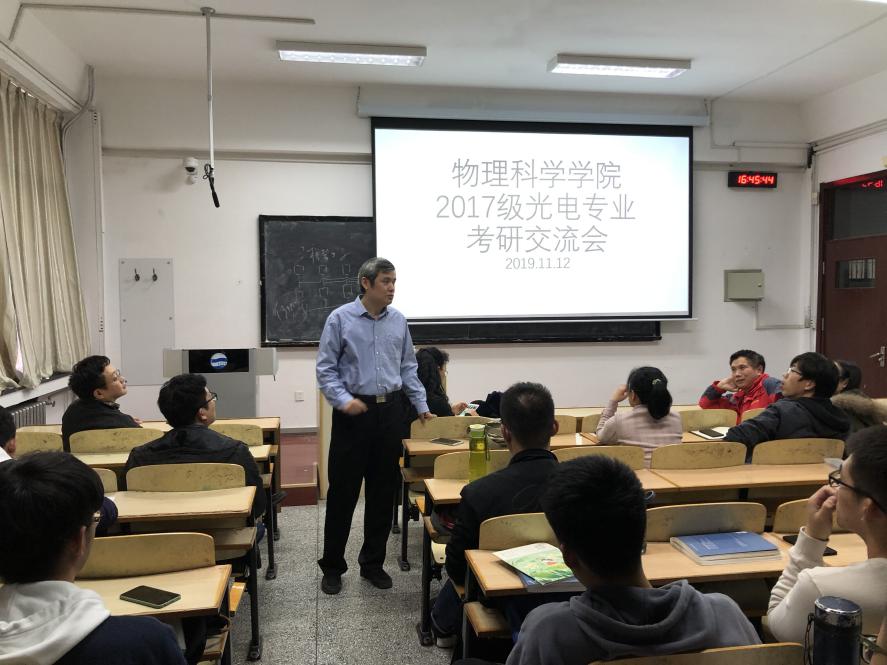 2017级光电专业考研交流会在博学楼302教室举行。出席本次交流会的有:院长滕冰教授、党委副书记郝伟老师、光电信息科学与工程系主任云茂金教授、陈戍老师、刘兵老师、徐洪浩老师、马军艳老师、钟石磊老师等,以及2017级光电专业一、二班全体同学。本次交流会由滕冰主持。