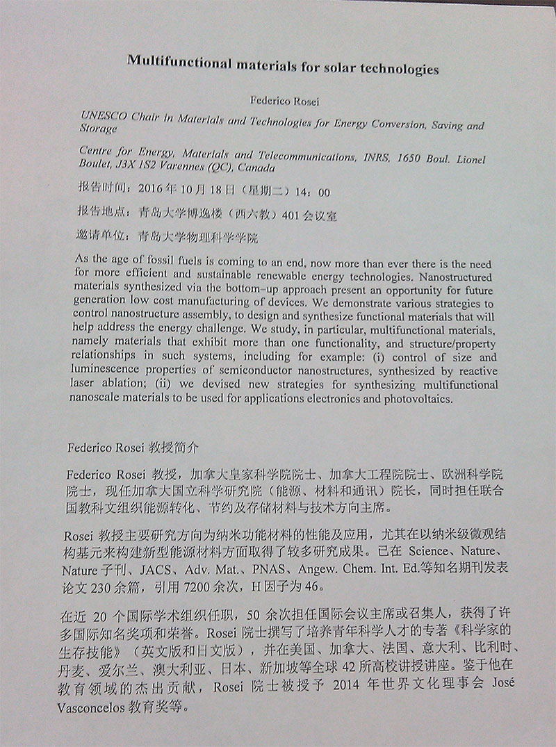 第十六期物理前沿学术报告:Federico Rosei学术报告会