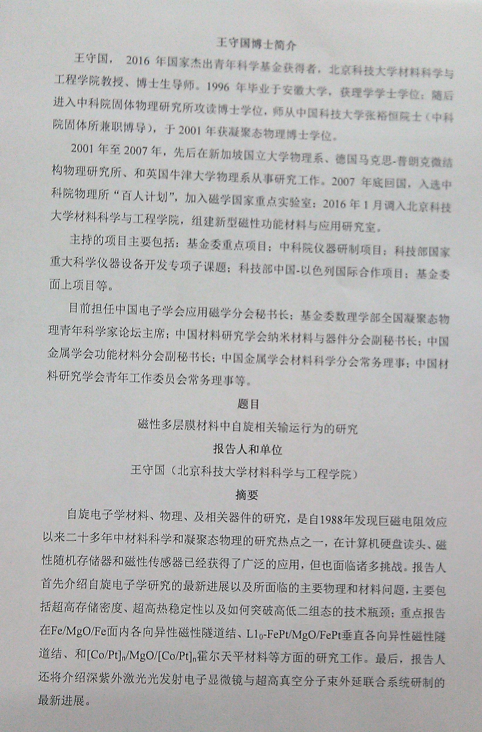 第十七期物理前沿学术报告:王守国教授报告会