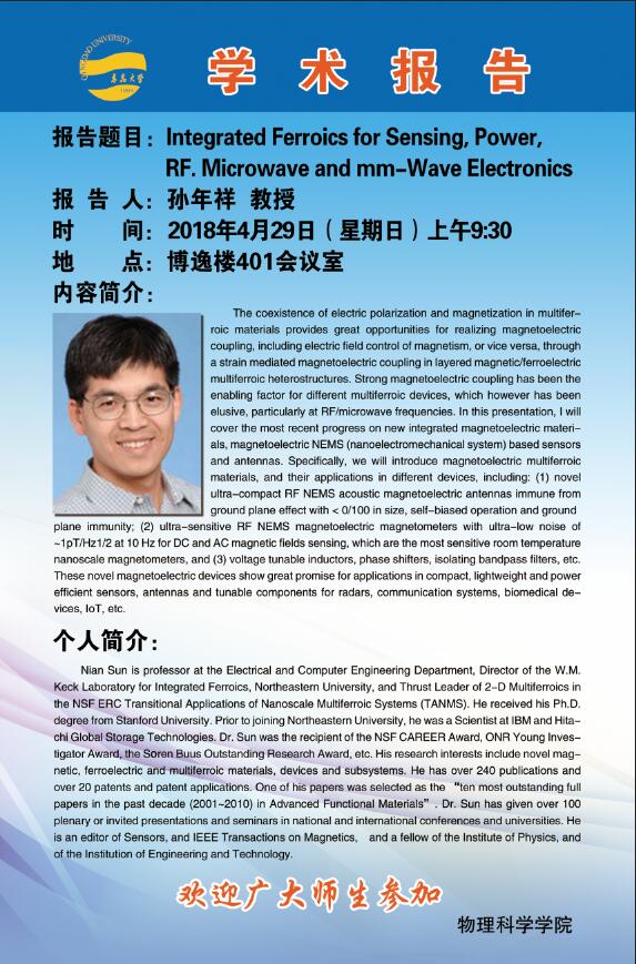 2018物理前沿学术报告第十一讲:Integrated Ferroics for Sensing, Power, RF. Microwave and mm-Wave Electronics