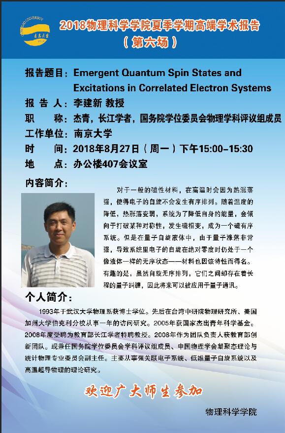 2018物理前沿学术报告第二十六讲:Emergent Quantum Spin States and Excitations in Correlated Electron Systems