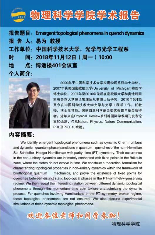 2018物理前沿学术报告第四十五讲:Emergent topological phenomena in quench dynamics