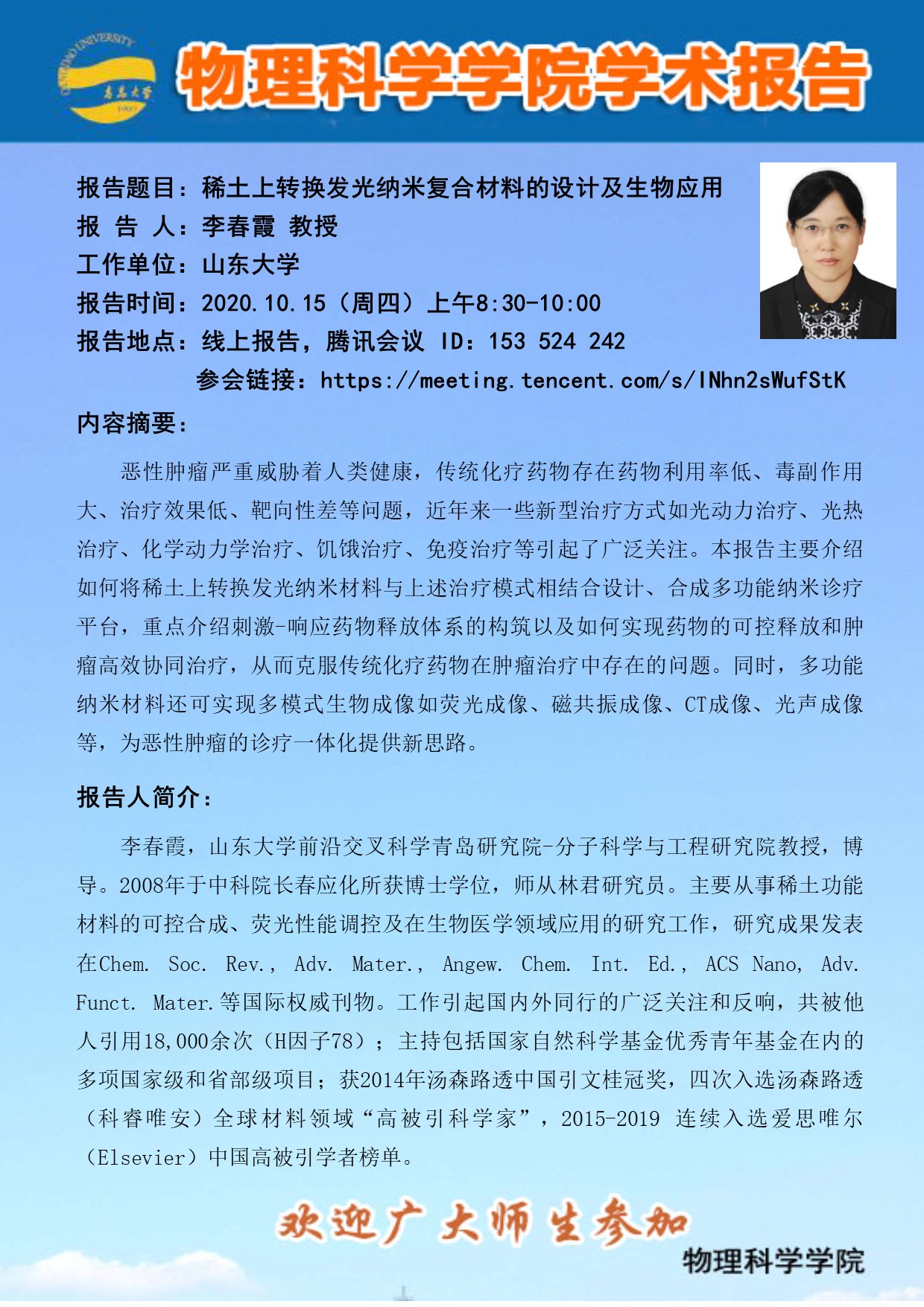 学术报告:稀土上转换发光纳米复合材料的设计及生物应用