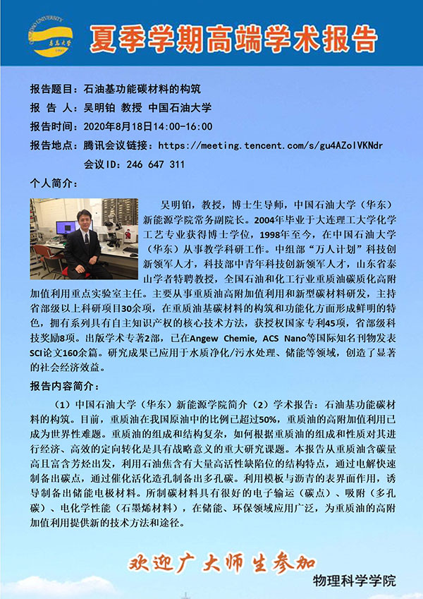 夏季学期高端学术报告:石油基功能碳材料的构筑