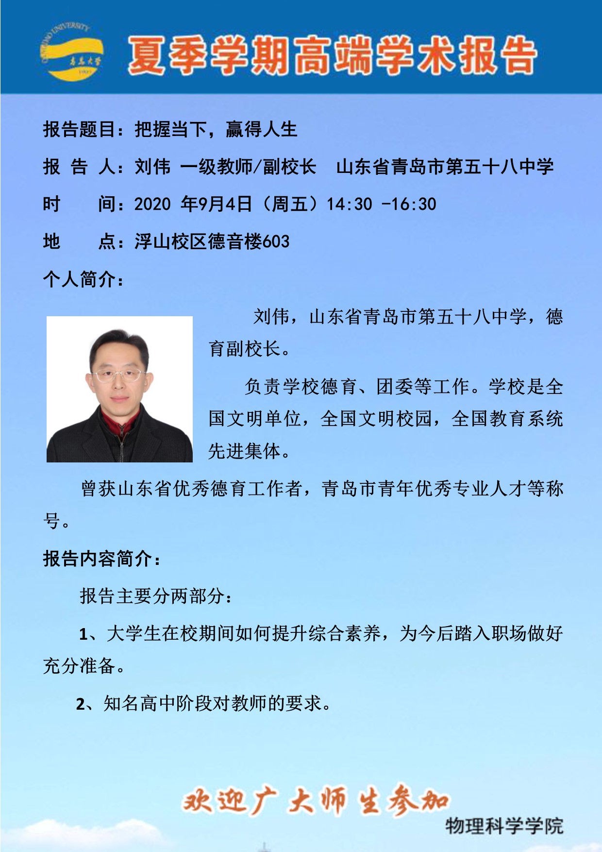 夏季学期高端学术报告:把握当下,赢得人生