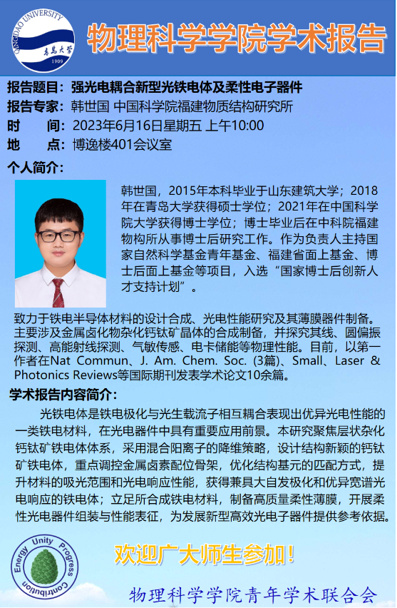[学术活动]韩世国-强光电耦合新型光铁电体及柔性电子器件