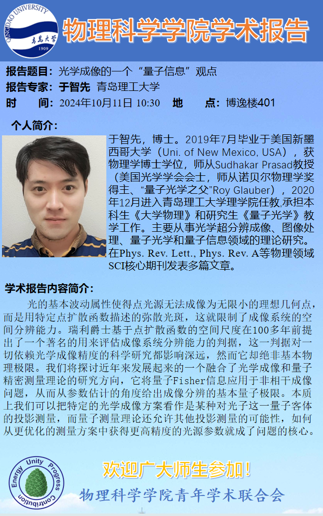 [学术预告]于智先-光学成像的一个“量子信息”观点