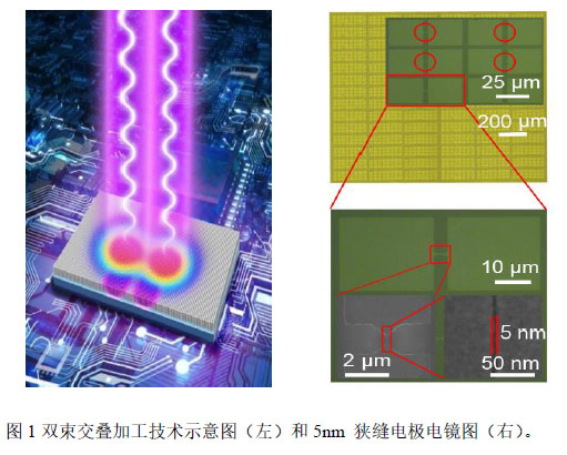 联合研究团队采用自行研发的超分辨激光直写装置(NA=0.9,入=405 nm),基于光热反应机理,利用无机钛膜作为光刻胶,发展了双激光束交叠加工技术(见图1a),通过精确控制能量密度及步长,实现了1/55入射波长的加工尺度,远超光学衍射极限1/2入射波长,达到了最小5 nm的特征线宽(如图1b)。这个研究中,研究团队还利用这种超分辨的激光直写技术,实现了纳米狭缝电极阵列结构的大规模制备(图1b)。相较而言,利用聚焦离子束刻写技术,制备一个纳米狭缝电极需要10到20分钟,而利用本文开发的激光直写技术,可以一小时制备约5×105个纳米狭缝电极, 展示了可用于大规模生产的潜力。