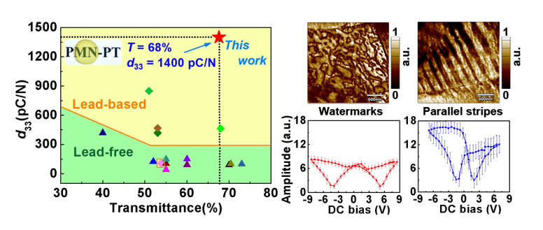 透明压电材料在透明压电触控传感器、光声成像透明换能器、透明驱动器等方面有着诱人的应用前景。但复杂的铁电畴结构使得压电材料的透光率一直较低,阻碍其在多功能器件领域的应用。2020年,兼具高透明度和高压电性Pb(Mg1/3Nb2/3)O3-PbTiO3(简称 PMN-PT)单晶的成功制备引起了广泛的关注,被评为2020年度中国科学十大进展之一。国际知名期刊Nature和Science也对该单晶材料给予了高度评价:“将光学功能耦合在了高性能压电晶体中,为力-电-光多功能耦合器件的研制打开了一扇门,及时地满足了当前日益增长的对多功能材料和器件的需求”、“透明高性能压电晶体将推动透明机器人、自供电触摸屏等器件的研制用于制作具有更高灵敏度的光声成像系统,在乳腺癌、黑色素瘤和血液疾病的诊断方面为医生提供帮助”。