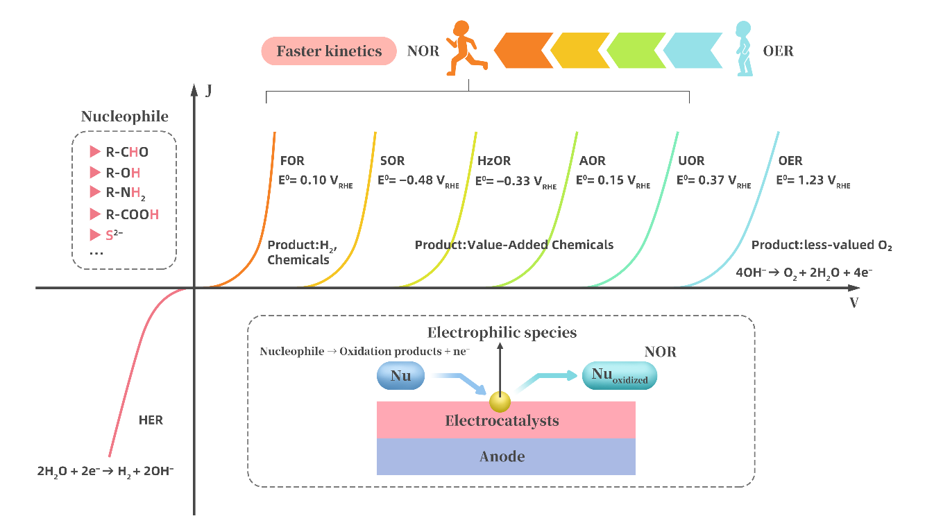 得益于高能量密度、零碳排放和可再生性等优势,氢被认为是化石燃料的理想替代品,预计氢气将缓解能源危机,实现全球碳中和。目前,电催化全水分解是一种清洁、高效的制备高纯氢的方法。电催化全水分解反应涉及两个半反应:阴极析氢反应(HER)和阳极析氧反应(OER)。然而,阳极析氧反应动力学缓慢,需要高电解电位和贵金属催化剂来克服反应能垒,导致能量消耗过多(>4.5-6 kWh m-3 H2)。此外,阳极析氧反应产生低价值的O2,它不仅干扰H2,并有爆炸的危险,构成安全隐患。尽管对高效催化剂进行了广泛的理论研究和实际开发,目前全世界H2总量中只有4%来自全水分解。因此,在电解水制氢体系中,引起了生物质氧化反应(如醛、醇、胺、尿素、肼等)代替阳极析氧反应的研究热潮。然而,对于这些氧化反应并没有统一的定义。本质上,具有活性氢的亲核基团(如醛基、羟基、氨基和羧基)或带有未共享电子对的负离子是这些生物质氧化反应过程中的反应位点。因此,亲核试剂氧化反应(NOR)可充分描述这些生物质电氧化过程。亲核试剂氧化反应NOR作为阳极析氧反应OER的替代品具有巨大的潜力。NOR提供更快的动力学,产生高附加值产品,并减少能源消耗。通过NOR与阴极析氢反应HER耦合,可以提高产氢效率,同时产生有价值的副产物或降解污染物。本论文重点探究了阳极氧化反应中不同NOR的反应机理和反应路径,旨在为今后NOR偶联HER制氢的研究提供理论指导。此外,NOR耦合制氢电解槽的设计对于产业化发展具有重要意义,其中无膜电解槽在大电流和耐久性方面更具优势,近几年取得了巨大进展。但是,NOR耦合制氢技术仍处于研发阶段,距离产业化还有很长的路要走。