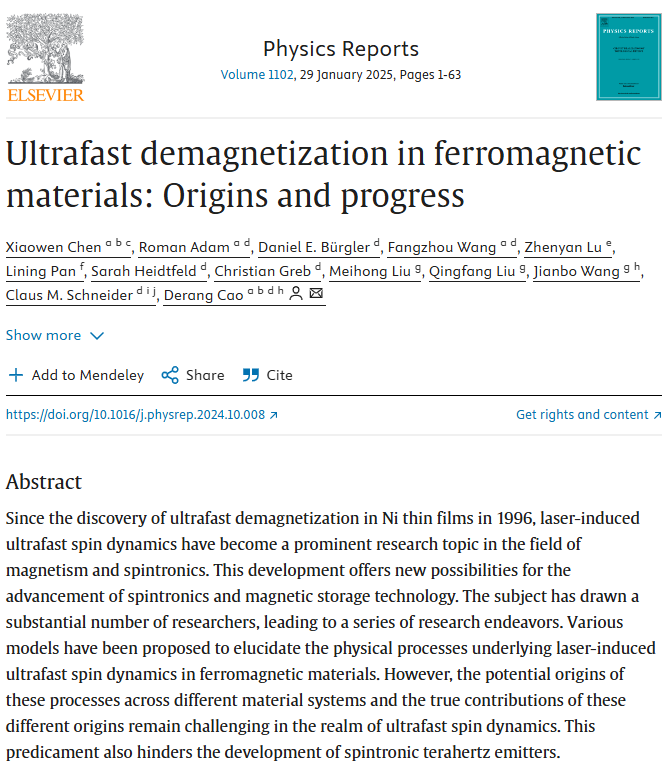 曹德让课题组应邀在物理学顶尖期刊《Physics Reports》上发表题为《Ultrafast demagnetization in ferromagnetic materials: Origins and progress》(Physics Reports 1102 (2025) 1–63)的长篇综述文章。青岛大学为第一完成和通讯单位。该工作得到了国家自然基金、山东省自然基金、中德博士后项目基金的资助。