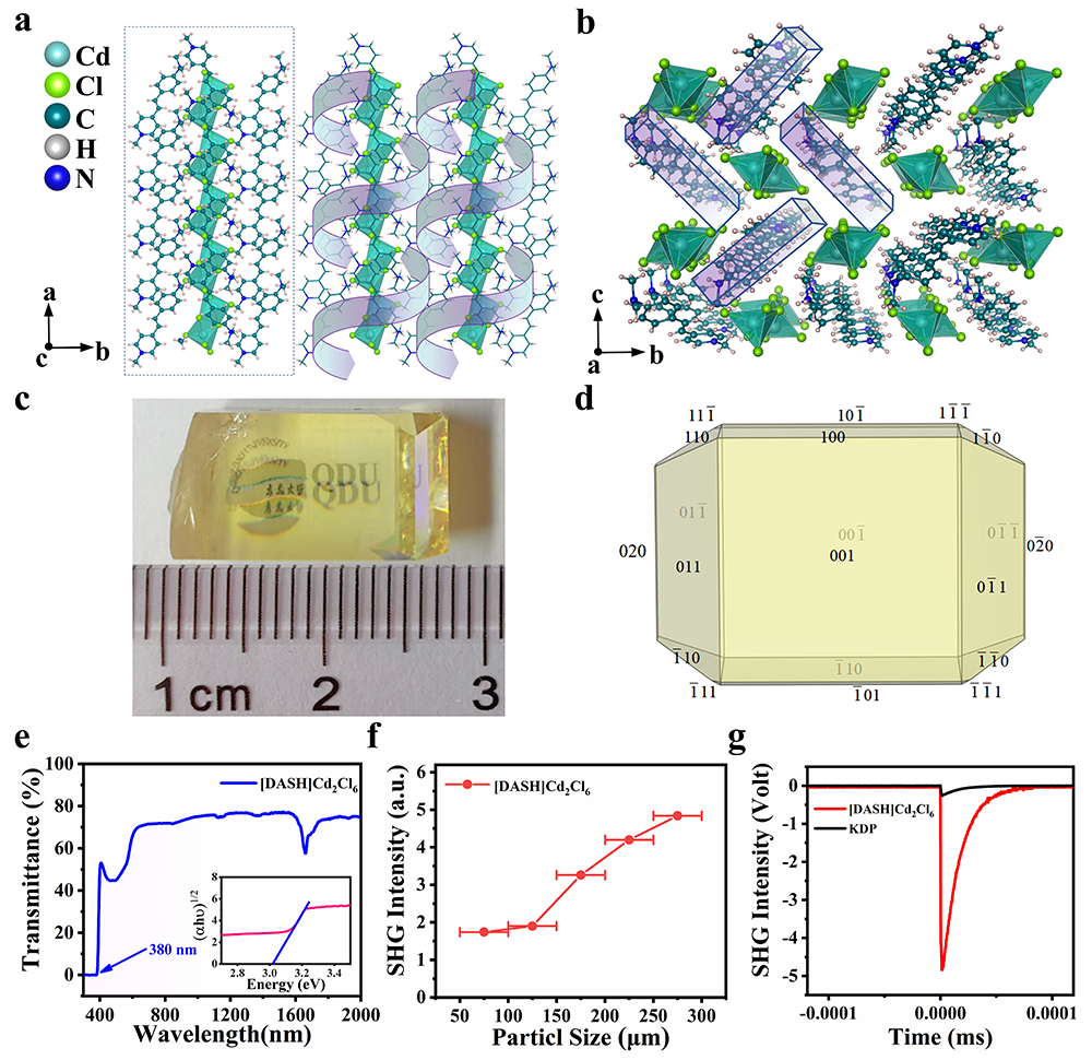 作为实现宽频太赫兹波输出的关键材料,现有机非线性光学晶体受制于稳定性差、生长加工困难、本征吸收等难题,严重制约了宽频太赫兹技术的应用开发。该成果提出质子化诱导氢键工程策略,并结合无机金属卤化物基团维度调控,实现了有机基团DAMS+强非线性效应与无机基团刚性稳定结构的融合,研制出大尺寸高稳定性有机-无机金属卤化物(OIMHs)非线性光学晶体[DASH]Cd2Cl6。该晶体在已报道无溶剂 OIMHs 类非线性光学晶体中表现出最强的二次谐波响应和最高的双折射率(0.36@550 nm),这为解决太赫兹波段专用高性能非线性光学晶体匮乏的问题提供了新思路。