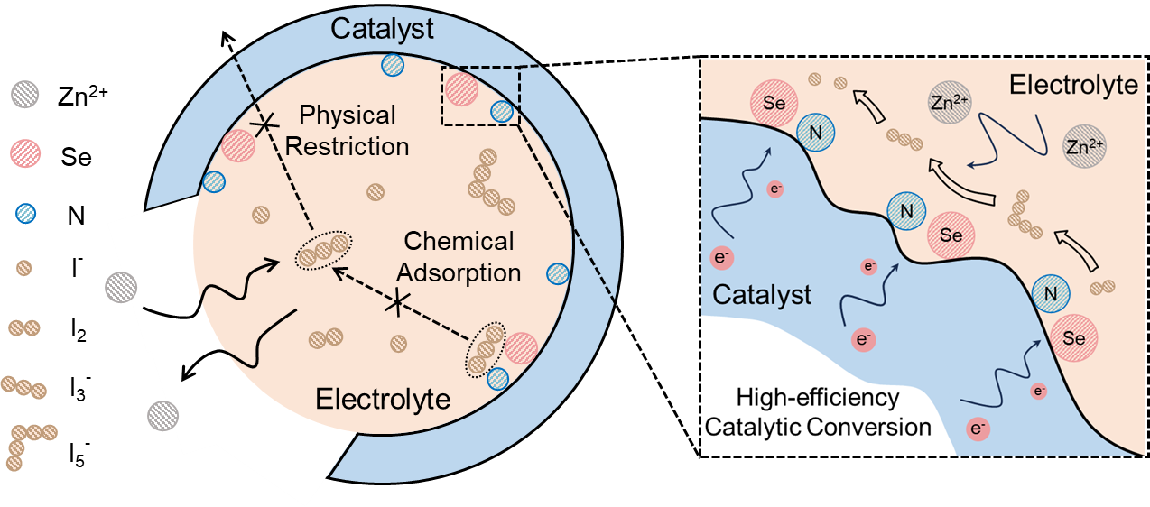 由于锌-碘电池具有理想的能量密度(理论上为272 Wh kg-1)、安全和环境友好性的优势,引起了广大的关注。然而,亲水性多碘化物中间体(I5-和 I3-)在电极上的穿梭,和缓慢的碘转化动力学严重影响了电池的实际性能。本文通过将原子级分散的半金属硒单原子(Se SAs)包埋在ZIF-8衍生的氮掺杂碳中,成功设计了具有双活性位点的高效碘宿主。这种设计触发了碘的快速转化,而且增强了多碘化物的锚定,抑制了I3-穿梭,实现了优异的倍率性能和循环寿命。原位表征和计算结果表明,除了多孔碳骨架的物理约束和增强的化学吸附外,碳上的Se SAs位点和N位点通过调制转化反应能垒实现了快速的 I0/I-偶联转化反应。这项工作为设计下一代水系锌-碘电池的高效I2宿主提供了有价值的见解。