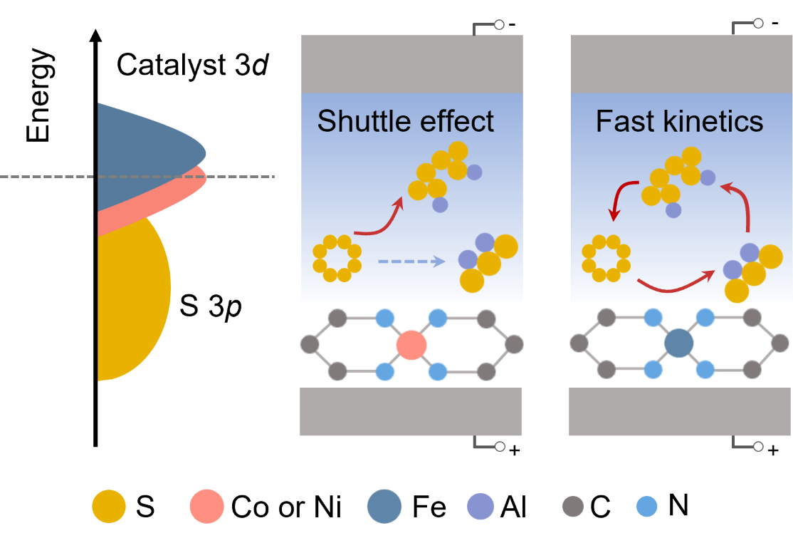 可充电铝硫电池因其独特的多电子氧化还原特性(S8↔Al2S3)与1675 mAh g-1的超高理论容量,近年来受到广泛关注并被视为最具应用前景的储能体系之一。在本工作中,研究人员制备了不同电子结构的铁磁性单原子负载多孔碳材料PC-SAFAs作为铝硫电池的催化,从电子结构角度出发,对不同过渡金属单原子催化剂与多硫化物轨道杂化状态进行分析,验证了催化剂自旋极化的提升对电化学性能有明显的改善。实验表明,当未配对电子数最多的PC-SAFe/S作为铝硫电池正极时,电池表现出了更优异的循环稳定性和倍率性能。对催化机制进行研究,发现该催化剂与多硫化物结合时,轨道杂化程度更强,电子传输更快。通过实验结合理论计算,该文章为设计新型高催化活性电催化剂提供了新的设计思路。