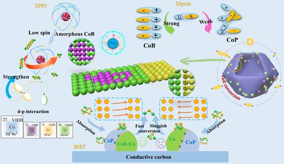 该工作提出通过引入非晶CoB相至Co-CoP异质结中,协同调控BIEF、自旋态与偶极耦合效应,实现LiPSs的高效吸附与快速转化。该研究提出内建电场强度在充放电过程中对异质界面多硫化物迁移具有不同影响,并证明非晶CoB相有效降低了Co-CoP的BIEF强度,促进了充放电过程中多硫化锂在异质界面的双向迁移。B掺杂诱导过渡金属Co的自旋态向低自旋构型转变,增强了d轨道电子局域化,减小了d-p能级间隙,并通过理论计算验证了钴与硫原子之间d-p轨道杂化的优化。与CoP中较弱的偶极矩相比,CoB内部偶极的均匀排列产生了适度增强的静电吸引力,这增强了对多硫化锂的键合效应,并提高了吸附-杂化性能。该研究提出了一种用于增强多硫化物限制/转化的多维协同调控机制(BIEF、自旋和偶极),该机制可推广至其他受穿梭效应困扰的电池体系。