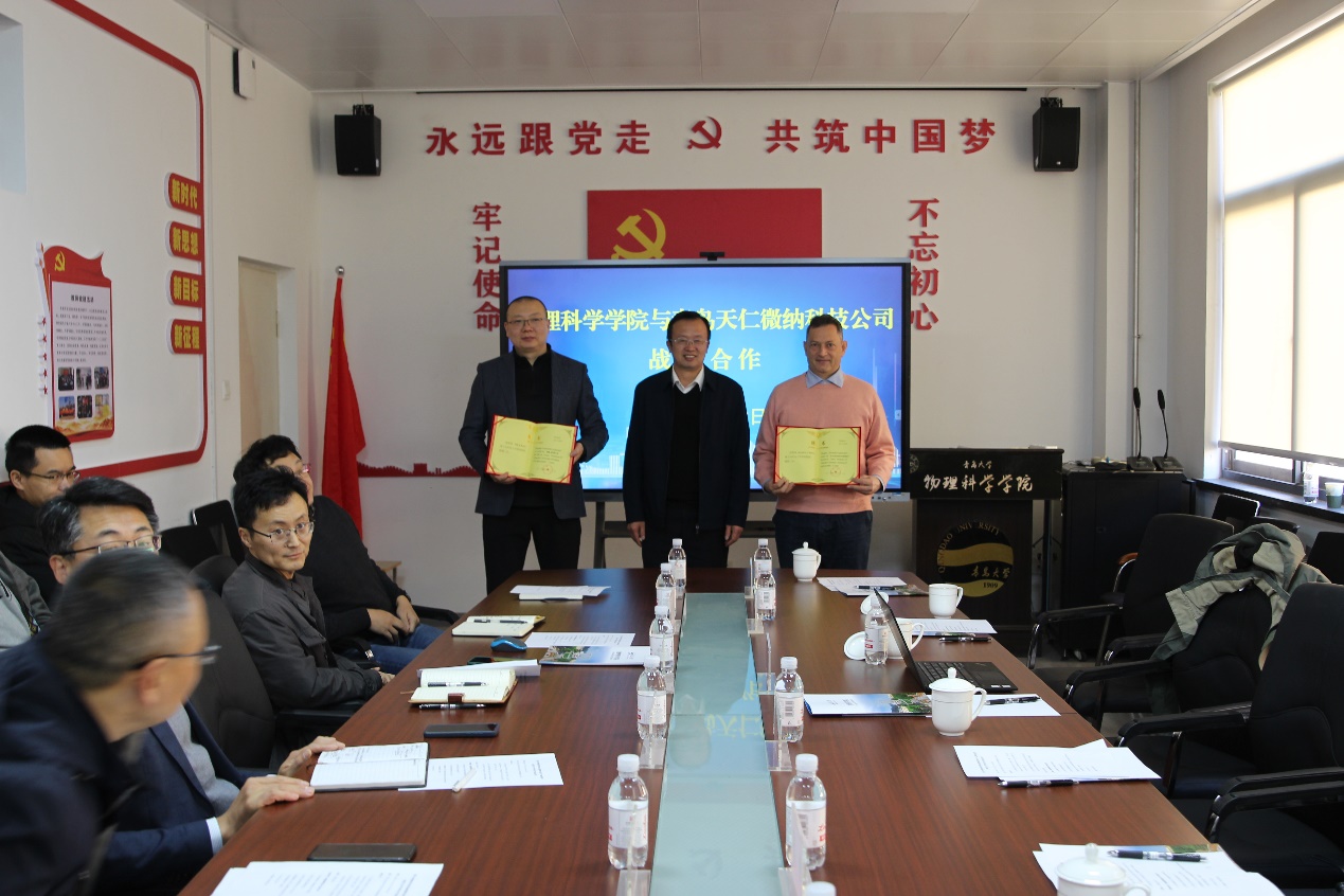 与青岛天仁微纳科技有限公司产学研合作签约暨客座教授聘任仪式在博逸楼401会议室举行。青岛天仁微纳科技有限公司董事长翼然博士、高级专家Massimo Tormen博士、监事张章、HR总监孙岩青、对外合作部董征、郝伦,十大色碟游戏网站