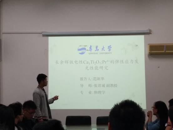 2015级研究生范新华在博逸楼401会议室作了题为《长余辉铁电性Ca3Ti2O7 :Pr 3+的弹性应力发光性能研究》的学术报告。色碟