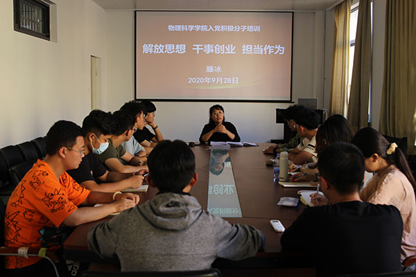 滕冰为入党积极分子作了题为《解放思想 干事创业 担当作为》的报告。她指出,解放思想非常重要,大学生要在学术上有所创新离不开解放思想,大家一定要保持与时俱进,时刻掌握科技前沿信息。她还结合色碟