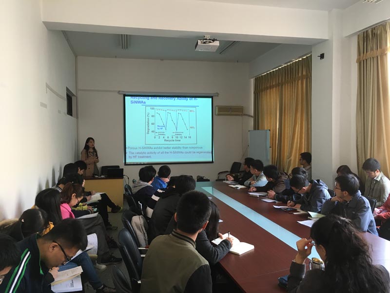 王凤云主要介绍了Si基材料和Ⅲ-Ⅴ族一维半导体纳米材料(InAs、GaAs)的设计、合成、表征及应用前景;二步法工艺合成纳米线;及可见光催化剂(多孔Si及In3+:CuV2O6)在处理污染问题等方面的研究。报告结束后,她详细解答了通过控制催化剂颗粒尺寸及晶型来控制所合成纳米线的直径及晶型等相关问题,并对研究生的学习生活和科研工作提出了建议性意见。