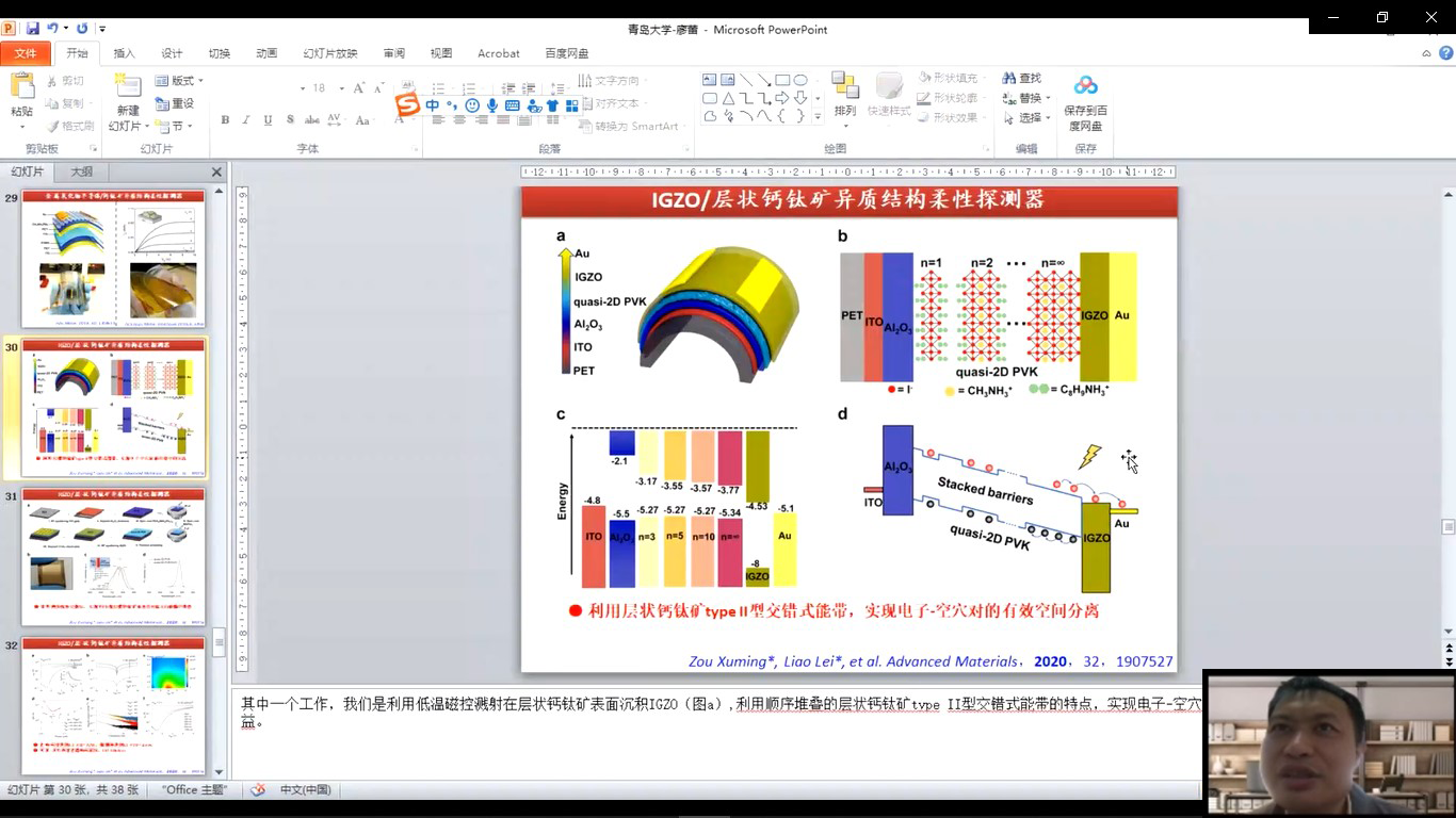 在报告中,廖蕾教授从钙钛矿材料、异质结和光电探测器等基本概念出发,展示了基于二维半导体/钙钛矿异质结构实现高灵敏度、快速响应光电探测器;采用金属氧化物半导体/钙钛矿异质结构构筑柔性、超灵敏、宽光谱光电探测器;开发高k材料/钙钛矿异质结构电介质实现高灵敏度、低噪声、高线性度光电探测器,详细的阐释了半导体材料在光电探测器中的应用、光电探测器性能的提升方案以及器件的结构设计等内容。随后,廖蕾教授结合自己的科研学术经历,向师生们展示了自己科研经历的心得体会,并提出了宝贵的意见。最后提问环节,廖蕾教授热情的回答了老师和同学们的问题,对光电探测器目前存在的问题以及未来的研究方向进行了深入的讨论。