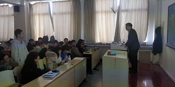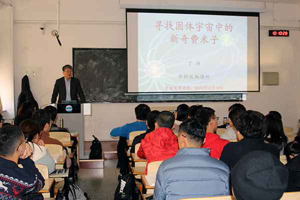 在报告中,丁洪首先介绍了根据基本粒子自旋分类的玻色子和费米子,然后重点介绍了宇宙中遵守费米统计的基本粒子(费米子)及其分类:有质量的狄拉克费米子、无质量的具有相反手性的外尔费米子、正反粒子相同的马约拉纳费米子以及人类目前在粒子物理领域对这三种费米子的发现及寻找,目前人们在真实的宇宙中只发现了狄拉克费米子,还未发现外尔费米子或马约拉纳费米子。丁洪指出,宇宙其实也是一种广义上的“材料”,人类其实也可以在固体材料这个“宇宙”中寻找新奇费米子。在固体材料中,一些低能准粒子与基本粒子可能遵循相同的物理规律,形成固体宇宙的费米子。近年来人们在固体宇宙中发现了外尔费米子,并找到了马约拉纳费米子存在的较强实验证据。同时人们又意识到固体宇宙与真实宇宙有差别,可能存在新型的费米子,如可能存在带有三重简并费米子。在这个报告中,丁洪也结合自己的角分辨光电子能谱(Angle Resolved Photo Emission Spectroscopy)实验方面的工作,介绍了其研究组在固体宇宙中发现外尔费米子、三重简并费米子和马约拉纳费米子的过程及相应发现。报告激发了学生对新奇费米子的极大兴趣,报告后学生踊跃提问,丁洪耐心地给学生们一一作了解答,气氛非常活跃。