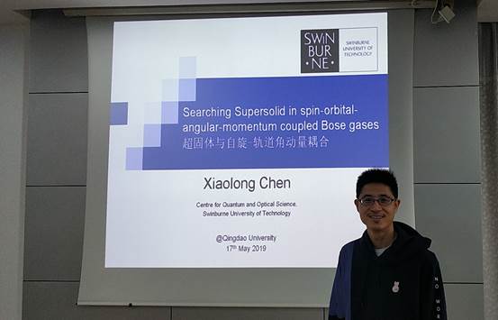 陈小龙在报告中首先介绍了什么是超固相,超固相在加压固态氦里面的实验探索,然后介绍了自旋轨道耦合以及自旋轨道角动量耦合的有相互作用的玻色子体系,介绍了这两个体系里面的基态相图以及表征超固相的条纹相在相图空间里面的位置、相空间的大小与原子种类、相互作用大小的关系,探讨了冷原子实验上找到超固相的实验参数条件。报告后,陈小龙博士与师生们进行了互动交流。