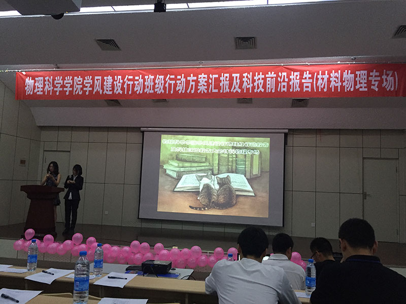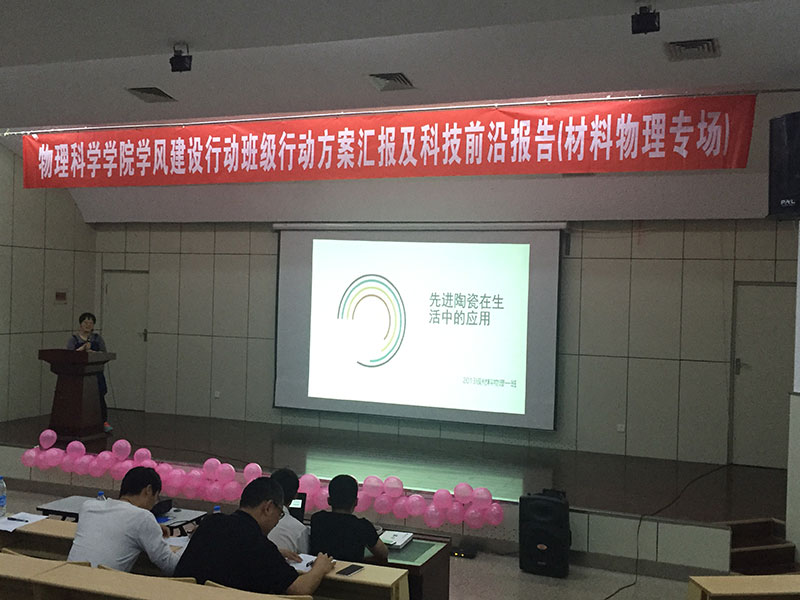 报告分上半场和下半场,上半场是班级学风建设行动汇报,专业老师就汇报内容提出问题,并提出意见和建议。下半场的专业科技前沿报告,各班自选主题,报告题目分别为:“先进陶瓷材料在生活中的应用”、“物理学风暴——神奇的‘超材料’”、”“一种前进广阔的材料——石墨烯”、“时代新秀——太赫兹”、“膜法传奇”,报告从选题到组织材料到制作PPT,同学们查阅了大量资料,对于其中的很多专业用词烂熟于心,报告集生动有趣与专业严谨为一体,又充分与材料物理的专业特色相结合,全场掌声此起彼伏。其中,又以2015级材料物理二班的黄娅的报告更为出彩,她和她的团队利用课余时间收集“膜”的相关知识,深入浅出的讲解了薄膜材料的原理、性能和应用、以及前景,脱稿讲解声情并茂,让枯燥的专业词汇变得灵动活泼,收获了全场师生的好评。