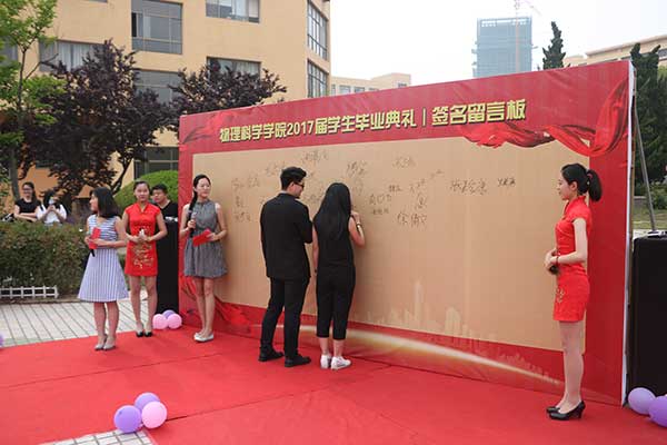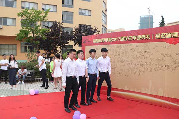 毕业典礼以毕业生的红毯秀拉开帷幕,物理学、光电、材料物理和新能源的主持人首先走上红毯,随后在主持人个性风趣的解说中,优雅帅气地毕业生们身着靓丽的服饰依次走过红毯,并在签名版上签名。参加典礼的老师也在毕业生的陪伴下走过红毯,与毕业生一起分享此刻的喜悦。