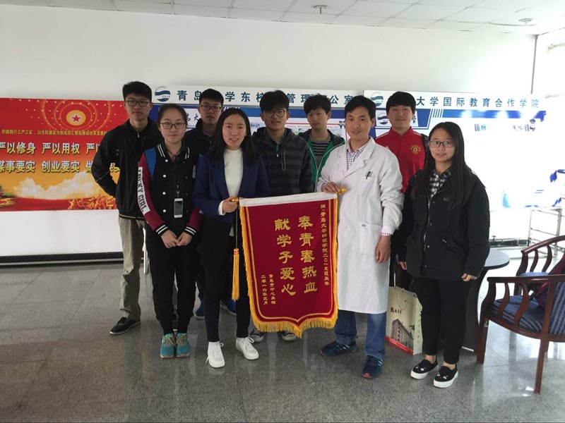 4月1日上午,青岛市中心血站工作人员携带一面写有“奉青春热血,献学子爱心”的锦旗来到十大色碟游戏网站 ,感谢十大色碟游戏网站 2015级学子对无偿献血的支持。