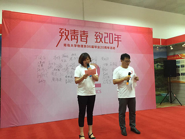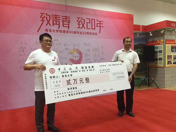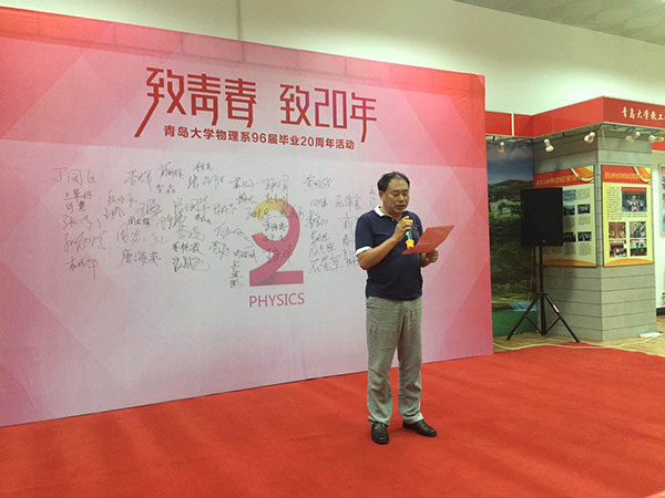 20年来发生的变化和取得的成绩。最后他说,母校的建设和发展所取得的成就,离不开你们给予的鼎力支持。在这里,我代表母校对你们倾注的深情厚意表示诚挚的感谢!也希望你们以后在各自岗位建功立业的同时,始终不忘关注母校的发展,积极建言献策!也希望同学们能够一如既往地常回家看看,母校永远是你们的家!92级物理的同学们还向色碟