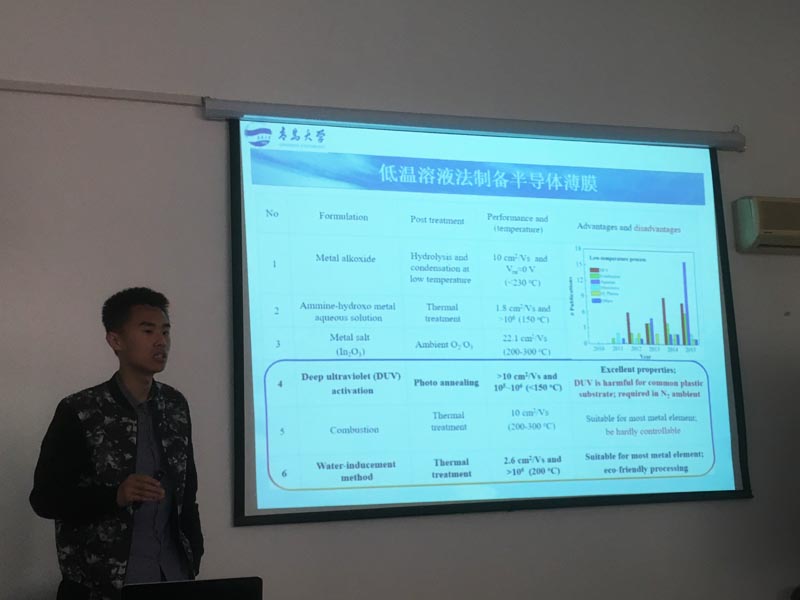 近年来金属氧化物薄膜晶体管凭借其高性能、低功耗、可大面积制备等优点在液晶显示领域扮演至关重要的角色。会上,刘奥详细介绍了薄膜晶体管(TFT)的发展历程、简介及其在新型柔性显示方面的应用;此外,还介绍了自己在该领域的部分研究工作——薄膜晶体管的制备方法;低温环保的水溶胶法制备复合In2O3/PVP薄膜晶体管;水溶胶In2O3薄膜晶体管和InZnO薄膜晶体管的电学性能表征。报告结束后,他就同学们提出的开关TFT与驱动TFT的区别、TFT制作过程中衬底改性(亲水性)的重要性、退火对薄膜缺陷和稳定性的影响等问题做了详细解答。最后,刘奥以自己亲身经历对研究生的科研工作提出了宝贵的意见。