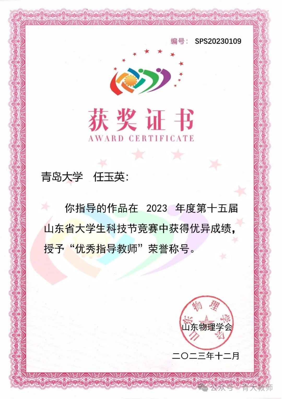 任玉英,执教大学物理26年,长期承担《大学物理》的教学,工作认真负责,获督学一致好评,多次评教位居前30%,多次被评为优质课程。近几年参与山东省大学生物理竞赛的力学辅导工作,多次被授予“优秀指导教师”荣誉称号。参与山东省大学生物理创新大赛的评审工作,承担全校大物三的期末试卷出题工作,承担老带新指导工作,参与《大学物理教程》高等教育出版社编写工作,参与青岛大学教学改革研究项目“一流本科教育背景下高校教材建设的研究与实践—以青岛大学基础物理教材建设为例”。